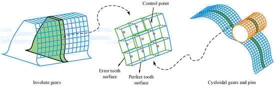 To comprehensively account for the effects of gear MEs, AEs, and tooth modifications (TMs), the authors previously developed error tooth surface models for involute gears and cycloidal gears and pins in [39,40], as shown in Figure 2. In this model, gear tooth surfaces are discretized into multiple uniformly sized micro-elements, each defined by a control point located at its geometric center. The cumulative geometric deviations induced by MEs, AEs, and TMs are transformed into equivalent normal displacements at these control points. Additionally, a tooth contact analysis algorithm and an improved gear meshing model for error tooth surfaces are proposed to support this framework, as detailed in the aforementioned references.