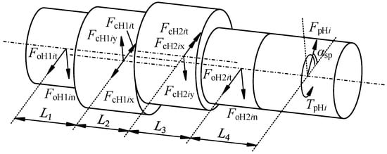 Based on the force interactions among the components and the balance between applied and reactive forces, the crankshaft is subjected to the planetary gear forces (FpHi and TpHi), the cycloidal gear forces (FcHjix, FcHjiy, and FcHjit), and planetary carrier forces (FoH1it, FoH1in, FoH2it, and FoH2in). These interactions are illustrated in Figure 4. Accordingly, the static equilibrium equations for the ith crankshaft are expressed as follows: