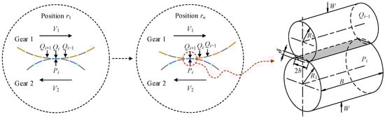 where ε1 and ε2 denote the sliding coefficients of the two contacting elements, with their analytical expressions introduced later in this section, while b is the contact half-width (Figure 6), which can be determined via Hertzian contact theory.