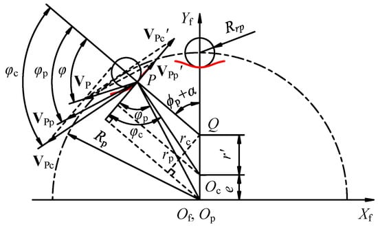 where Vp represents the velocity of the contact point P; VPp and indicate its velocity components due to the pin’s rotation and sliding along the pin surface, respectively; VPc and denote its velocity components due to the cycloidal gear’s rotation and sliding along the cycloidal tooth surface, respectively; and φ, φp, and φc define the orientations of Vp, VPp, and VPc relative to the line connecting point P to the pin’s center, respectively.