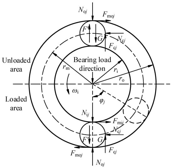 In the loaded zone, each rolling element is simultaneously in contact with both the inner and outer raceways under radial load, while the cage is driven forward by the rolling elements. The rolling elements are primarily influenced by the normal forces (Nij and Noj) of the inner and outer raceways, the frictional forces (Fmij and Fmoj) of the inner and outer raceways, the cage’s normal and frictional forces (Ncj and Fcj), and the centrifugal and gravitational forces (F’ and G). Accordingly, the force equilibrium equations for the rolling elements in the bearing radial and circumferential directions, as well as for the rolling element rotation direction within the loaded zone, are established as follows: