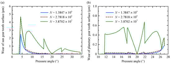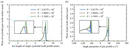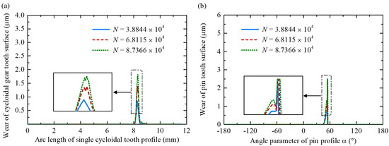In addition, the static analysis of the RV reducer was used to provide loading conditions for both the tooth surface wear model and the bearing wear model. Under these conditions, the wear increments of each discrete tooth surface element, Δδij, and the bearing, Δδb, per cycle were calculated, and their total wear amounts, δij and δb, were accumulated. When δij or δb exceeded a defined threshold (δt_lim or δb_lim), the total number of output shaft cycles (TN) was recorded, and an updated error tooth surface model was reconstructed based on the accumulated wear. This procedure was repeated until the TE or LM of the RV reducer surpassed the allowable limit (e.g., 60 arcsecs), at which point the transmission accuracy across different cycle counts and the TAL of the RV reducer were determined. The TAL can be expressed as follows: