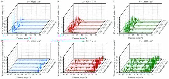According to the test results, TE decreased only slightly during the initial operation of the reducer, with its fluctuation range within 1550 h not exceeding 4.2 arcsecs. LM increased rapidly within the first 600 h of operation, which was attributed to significant micro-morphology differences caused by tooth profile deviations. The areas with larger tooth profile deviations wear worn first. Additionally, the initial number of contacting tooth pairs was low due to tooth pitch deviations, leading to higher tooth surface contact pressure and intensified wear. After the running-in period, the influence of tooth profile deviations on LM weakened. As wear accumulated, the average number of contacting tooth pairs increased, resulting in reduced tooth surface contact pressure and a slower tooth wear rate. Therefore, after 600 h, the LM growth rate stabilized at approximately 0.0024 arcsecs/h. Over the 1550 h test, the LM of the RV reducer increased from 42.7422 arcsecs to 55.6631 arcsecs, yielding a total rise of 12.9209 arcsecs. The degradation trends of TE and LM were consistent with the theoretical results presented in Figure 18.