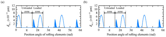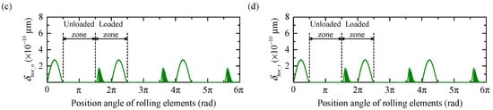 Each rolling element forms three friction pairs with the inner raceway, outer raceway, and cage within the loaded zone, and two friction pairs with the outer raceway and cage within the unloaded zone. Considering the cage’s lower wear resistance relative to the rolling elements, only wear between the rolling elements and the raceways is analyzed in this study. Based on the Archard wear model introduced above, the wear amounts at different angular positions φj are expressed as follows: