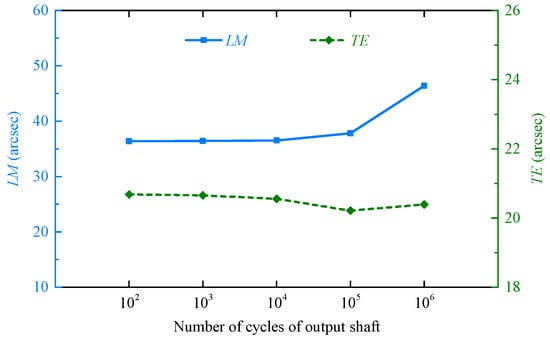 - Both theoretical and experimental results have revealed that the TE of RV reducers remain relatively stable during operation, while the LM increases notably due to the influence of tooth surface and bearing wear, particularly during the first 600 h of test. Beyond 600 h, LM increases at 0.0024 arcsecs/h. Over the 1550 h test, the LM exhibited a total growth of 12.9209 arcsec, representing a 30.23% growth relative to initial LM, with its growth rate substantially surpassing that of TE. Based on these findings, the progressive increase in LM is the primary cause of transmission accuracy degradation in RV reducers, and LM is recommended as the primary evaluation index for TAL of RV reducers.