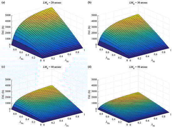 Based on the TAL estimation model described above, a multivariable linear regression was performed for the TAL of the RV reducer under different initial LM conditions (Figure 19). Because the instantaneous number of contacting teeth in the cycloid-pin and involute gear pairs must be at least one, data points with λHc < 0.025 and λHi < 0.318 were excluded from the analysis. The resulting regression coefficients and intercept of the TAL model are presented in Table 3.