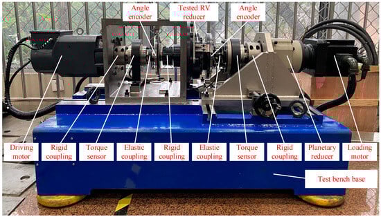 The TAL test rig is illustrated in Figure 20, consisting of a driving system, a loading system, and the tested RV reducer. The driving system comprises a driving motor, a torque sensor, and an angle encoder, while the loading system includes a loading motor, a planetary reducer, a torque sensor, and an angle encoder. To eliminate the influence of torque fluctuations and elastic coupling clearance on test results, the elastic coupling was positioned outside the angle encoder. The angle encoders used for the input and output shafts were RESM20USA200 and RESM20USA229 manufactured by Renishaw plc, Gloucester, UK, with system accuracies of ±1.05 arcsecs and ±0.92 arcsecs, respectively. In order to expand the test rig’s applicability, two slide rails were incorporated for horizontal and vertical movements, implemented via ball screws. This configuration allows the test rig to measure the transmission accuracy of both coaxial input-output reducers and parallel-shaft reducers with different center distances.