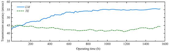 During the TE test, the input shaft of the RV reducer was driven by the driving system, and after achieving stable operation, the real-time rotation angles of the input and output shafts were recorded to obtain the TE curve. The LM was typically determined from the hysteresis curve of the reducer, which required fixing the input shaft and gradually loading the output shaft to its rated load before unloading. To avoid measurement errors caused by repeated disassembly of the input shaft fixture, the bidirectional TE method was adopted for LM measurement. In this method, the forward and reverse TE curves of the reducer were first tested under stable load, and their difference was used to obtain the dynamic LM curve of the reducer [10,36]. The average value of this dynamic LM curve was taken as the LM of the RV reducer at a specific moment. This approach ensured that the transmission accuracy data were obtained under consistent AEs throughout the service life of the RV reducer. In the accelerated TAL test, the reducer was operated forward for 5 h and backward for 5 h, and the TE and LM were tested and recorded every 10 h. The output torque and rotational speed were set to 572 N·m and 5 r/min, respectively. The total test duration was 1550 h, and the degradation curves of TE and LM are shown in Figure 21.