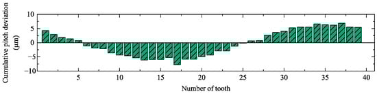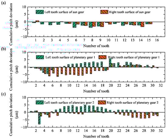 Cumulative pitch deviations of (a) sun gear, (b) planetary gear 1, and (c) planetary gear 2.
