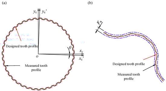 The cycloid-pin drive in RV reducers typically includes two cycloidal gears to improve the reducer’s smoothness. The accuracy of these gears was measured using the P26 comprehensive precision tooth profile tester. During testing, the gear rotated while a probe automatically traced the tooth surface to measure its 3D profile. Due to AEs and the random starting position of the measurement, the recorded tooth profile was eccentric and had a phase difference relative to the designed tooth profile (Figure 23a). To address this issue, the position of the measured tooth profile was corrected according to the minimum distance principle before data processing. The resulting tooth profile deviation is defined in Figure 23b, and the precision test results for the cycloidal gears are summarized in Table 5.