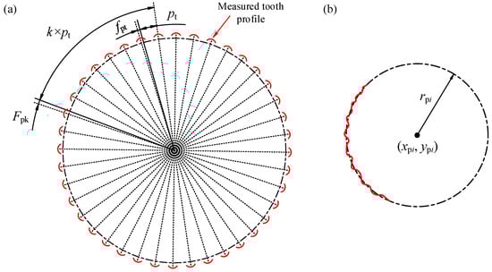 (a) Measured profiles with pitch deviation definitions, and (b) center and radius of the ith pin groove.
