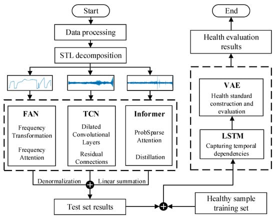 First, data preprocessing is performed through cleaning and normalization to reduce the interference of noise, outliers, and dimensional differences on the model. Second, dataset partitioning is conducted, using the initial healthy data of equipment as the training set to ensure that it contains only healthy samples, thereby enabling the model to clearly distinguish between “healthy” and “abnormal” distributions and improve the identification accuracy of early degradation trends. Third, the SFTI-LVAE model is constructed. In the prediction phase, STL is first utilized to decompose high-dimensional time series into trend, seasonal, and residual components, then the FAN module is employed for feature extraction and attention allocation to highlight key features and suppress noise. Subsequently, the improved Informer is used to predict each component, and finally, the predicted sequence is obtained through inverse transformation and fusion. In the health assessment phase, the model is trained using healthy data, where LSTM first extracts temporal dependency features, and then the VAE learns the distribution of healthy samples to establish a baseline model. When input data conforms to the healthy distribution, the reconstruction error is low, indicating healthy samples; conversely, high reconstruction error indicates abnormal or degraded samples.