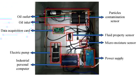 In practical applications, the key indicators that need to be monitored for different types of lubricating oils are not limited to a single parameter. Multiple other indicators are equally critical for determining the operational status of lubricating oil, recommending oil change intervals, and assessing the health condition of intelligent diagnostic equipment [25]. Based on this understanding, our research team designed and developed an online lubricating oil monitoring system for the real-time monitoring of key indicators, including the physicochemical properties and wear particles of lubricating oil [26]. The physical structure of this system is illustrated in Figure 3, with the main monitoring equipment listed in Table 3. The detailed experimental procedures have been thoroughly documented in the related literature and will not be reiterated here [27]. The online monitoring system integrates multiple specialized sensors, as follows: the ARGO-HYTOS OPCom II (ARGO-HYTOS GmbH, Kraichtal-Menzingen, Germany) particle contamination sensor monitors wear particles at ISO 4 μm, 6 μm, 14 μm, and 21 μm sizes; the ARGO-HYTOS LubCos H2Oplus II (ARGO-HYTOS GmbH, Kraichtal-Menzingen, Germany) micro-moisture sensor measures moisture content in ppm; and the MEAS FPS2800B12C4 (Measurement Specialties, Inc. a TE Connectivity company, Grass Valley, CA, USA) fluid property sensor provides real-time measurements of dielectric constant, viscosity, density, and temperature. These sensors enable comprehensive real-time monitoring of lubricant condition and degradation indicators.