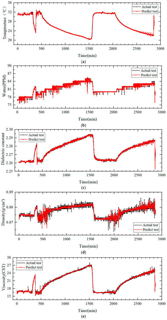 The prediction curves for the dielectric constant in Figure 4c and viscosity in Figure 4e show similar trends, exhibiting an upward trend after small fluctuations in the early stage, with rapid declines around points 1500–1580 and 2870.