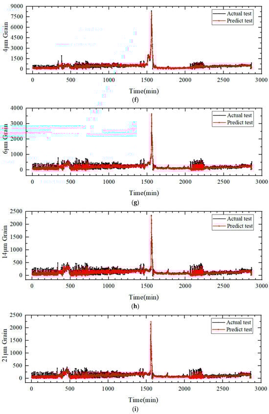 The four wear particles with different sizes presented in Figure 4f–i show the following highly consistent variation trends: fluctuating upward then declining from points 280 to 480; stabilizing from points 500 to 1480; surging then rapidly declining from points 1510 to 1540; and fluctuating from points 2020 to 2300, with stability in other phases. The predicted values are generally positioned in the middle region of actual values, effectively capturing overall trends, though with deviations in local peak and valley values. The overall results demonstrate that the model can reasonably capture overall trend changes and individual sudden variations, exhibiting a high reliability and consistency in long-sequence trend prediction.