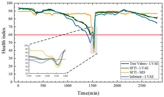 Based on the aforementioned model configurations, comparative experiments for health condition assessment were conducted on the lubricating oil system. As illustrated in Figure 5, the four curves, respectively, demonstrate the following: the real-time assessment results of LVAE based on measured data; the predictive assessment results of SFTI-LVAE, integrating time series forecasting with deep learning; the performance of the SFTI-MD statistical method employing Mahalanobis distance; and the LVAE assessment results based on the conventional Informer algorithm. Through multidimensional visualization comparison, the differences among various methods in health degradation trends, abrupt point identification, and early warning effectiveness can be intuitively observed, prominently showcasing the comprehensive advantages of the proposed model. In Figure 5, the health index (HI) represents the normalized reconstruction error output from the LVAE model, where higher values indicate a better lubricant condition (closer to a healthy state), and lower values indicate a higher deviation from a healthy distribution and potential degradation.