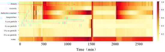 The experimental data collection period spanned from 1 to 6 April 2017, with a sampling frequency of once per minute. The system can simultaneously monitor multiple physicochemical properties and wear parameters, including viscosity (cSt), temperature (°C), wear particles (particles/mL), moisture content (ppm), and others, achieving a daily sampling volume of 1440 data points. The viscosity values shown in Table 3 refer to the real-time kinematic viscosity (in cSt) as measured by the MEAS FPS2800B12C4 sensor at the corresponding recorded temperatures. The dielectric constant reflects the relative permittivity of the lubricant, indicating its ability to store electrical energy within an electric field, and is sensitive to contamination, oxidation, and chemical degradation. Table 4 presents a portion of the online lubricating oil monitoring dataset. The lubricating oil used in this study was SAE 15W-40 diesel engine oil conforming to the API CI-4 specification. According to the SAE J300 standard [28], this multigrade oil has a kinematic viscosity range of 12.5–16.3 cSt at 100 °C for the SAE 40 grade, with a winter performance meeting SAE 15W requirements for cold-weather operation. The oil had an initial kinematic viscosity of 14.2 cSt at 100 °C and a viscosity index of 140. The base oil was a conventional mineral oil blend with typical additive packages, including detergents, dispersants, antioxidants, and anti-wear additives suitable for heavy-duty diesel engine applications. Through this experiment, the system demonstrated its capability to comprehensively and accurately reflect the condition of lubricating oil, providing robust data support for equipment operation and maintenance.