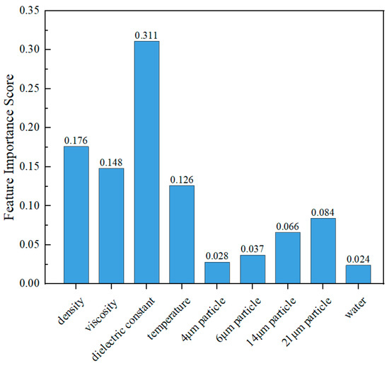 Combining the parameter contribution analysis in Figure 6 can further elucidate the intrinsic mechanisms of lubricating oil health changes. Observing the first decline in the green curve around point 350, density, viscosity, dielectric constant, and temperature all exhibit significant degradation contributions. This phenomenon highly aligns with the feature importance analysis results in Figure 7—the importance scores of these parameters reach 0.176, 0.148, 0.311, and 0.126, respectively, occupying dominant positions among all monitoring parameters. When the contribution values of these four parameters decline, the green curve correspondingly recovers.