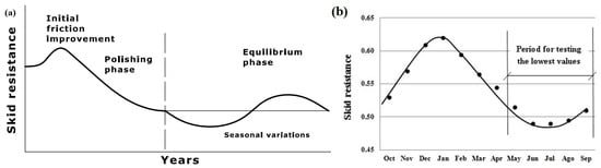 The behavior of skid resistance over time has been extensively analyzed, leading to the development of an internationally accepted model to represent its performance as pavements age (Figure 1a) [,]. This model reflects the influence of factors, such as traffic-induced polishing, environmental conditions, and material properties, providing a standardized framework for predicting and managing skid resistance throughout the pavement’s service life. The evolution of skid resistance on newly constructed pavements follows a distinct pattern. Initially, a bituminous film covering the aggregates results in relatively low skid resistance. However, as this film is worn away by traffic, the micro-texture of the aggregates is exposed, leading to a rapid increase in skid resistance. Following this peak, the surface undergoes a polishing phase characterized by a high initial rate of skid-resistance loss, driven by the interaction of traffic with the exposed aggregate. Over time, this rate slows, and the pavement reaches an equilibrium phase where skid resistance stabilizes at an asymptotic value determined by the inherent properties of the aggregates and the level of traffic polishing [,]. At this equilibrium phase, seasonal and short-term variations are the only fluctuations. Nevertheless, there is no established consensus regarding the duration of each phase. The duration of the polishing phase, depends on the binder type, its quantity, and the characteristics of heavy traffic [,]. In Spain, the initial increase typically lasts between 2 and 3 months [,]; however, in other countries, this period can extend up to 4 years due to the durability of polymer-modified bitumen []. Variations in the duration of the polishing phase have also been reported, ranging from 4 to 5 years [] to one year [,].