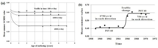 The degree of polishing is directly correlated with traffic intensity, particularly the volume of heavy traffic [,]. It has been reported that, under equal conditions, roads with higher volumes of heavy vehicles tend to exhibit the lowest skid resistance []. Heavy traffic contributes to the erosion of fine-scale micro-texture, and an increased presence of heavy vehicles results in a reduction in skid resistance []. This relationship is illustrated in Figure 2a, based on research conducted in the UK with aggregates having a PSV between 58 and 60 []. The initial decrease in the skid resistance coefficient is attributed to the polishing phase, which stabilizes once the equilibrium phase is reached. Consequently, the effect of heavy traffic should not be considered cumulative over successive years, as it is primarily influenced by traffic intensity and aggregate properties, assuming consistent weather conditions [,,,]. However, if the intensity of heavy traffic fluctuates—such as changes in the annual average daily traffic (AADT)—the available skid resistance may also vary, potentially increasing, as observed on the A4 road in Colnbrook (UK) when a new freeway was introduced [] (Figure 2b). A similar phenomenon was also observed on the N-VI in León, Spain [].