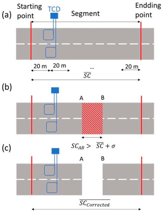 However, since, in this study, detailed information regarding the age or materials of the surface layers is unavailable, each segment is only defined by areas with the same traffic volume. Therefore, in these segments, which were determined by a traffic-counting device (TCD) and ranged from hundreds of meters to several kilometers long, many SC values are measured. From all of these measurements, a mean SC value, together with the standard deviation, was calculated for each segment (Figure 3a).