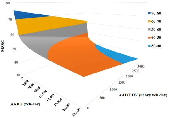 Finally, Figure 5 provides a graphical representation of the expected MSSC values as a function of AADT and AADT.HV according to Equation (10). Different colors can be seen depending on the MSSC value. For low AADT and AADT.HV values, high MSSC values are expected, as low traffic volumes do not deteriorate the pavement as much, so friction values are high. On the other hand, when traffic volume increases, MSSC decreases. By fixing the number of light vehicles but increasing the number of heavy vehicles, we also see a considerable decrease in the MSSC. This clearly reflects the influence of heavy-vehicle traffic on SC, aligning well with the findings in previous research.