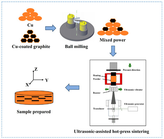 Cu-coated graphite powders and Cu powders were selected as raw materials to minimize the density difference between Cu and graphite and improve the interfacial bonding between graphite and Cu, ensuring homogenous distribution of graphite within the Cu matrix. The Cu-coated graphite powders (50 wt.% copper content, which were prepared by the electrochemical deposition method, as claimed by the manufacturer, and the density of which was 3.54 g/cm3) were purchased from NangongJinnuo Welding Materials Co., Ltd., Nangong, China, while electrolytic copper powders (99% purity) were purchased from Shanghai Yunfu Nanotechnology Co., Ltd., Shanghai, China. To systematically investigate the effect of graphite content on the densification behavior and properties, six different volume fractions of graphite (ranging from 5 to 30 vol.%) were chosen, with pure Cu samples prepared under identical processing conditions for comparison (as shown in Table 1). As shown schematically in Figure 1, the powder mixtures were mechanically blended by dry ball milling (horizontal ball mill: GM/B-3; Jintong General Machinery Co., Ltd., Xianyang, China) for 5 h and then were loaded into graphite dies. To obtain near fully dense Cu–graphite composites, a two-stage ultrasonic-assisted process was utilized in an ultrasonic-assisted hot-press sintering furnace (UHP-5T-H-G-18-MIN; Shanghai Chenhua Science and Technology Co., Ltd., Huzhou, Zhejiang, China). In the first step, ultrasonic vibration (with an ultrasonic frequency of 20 kHz, an ultrasonic amplitude of ~15 μm and an ultrasonic power of 600 W) was applied at room temperature under a 30 MPa pressure for 10 min. In the second step, sintering was conducted at 700 °C for 10 min under a 30 MPa uniaxial pressure, with continuous ultrasonic excitation maintained throughout the holding stage. For comparison, Cu–graphite composites with the same compositions were prepared by the single-step ultrasonic-assisted process, i.e., the ultrasonic wave was only applied at 700 °C during the holding stage with other preparation parameters unchanged.