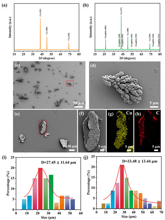 The XRD patterns of (a) Cu and (b) Cu-coated graphite. SEM image of (c) Cu powders and (d) an enlarged view of the particle labeled in red rectangle. (e) SEM image of Cu-coated graphite powders and (f) an enlarged view of the particle labeled in red rectangle, and the corresponding EDS mapping of Cu (g) and C (h). Particle size distribution of Cu powder (i) and Cu-coated graphite powder (j).