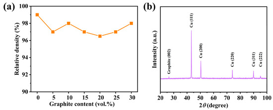 (a) Relative density of Cu–graphite composites prepared by UAHP plotted as a function of graphite content. (b) The XRD pattern of Cu–20 vol.% graphite composite.
