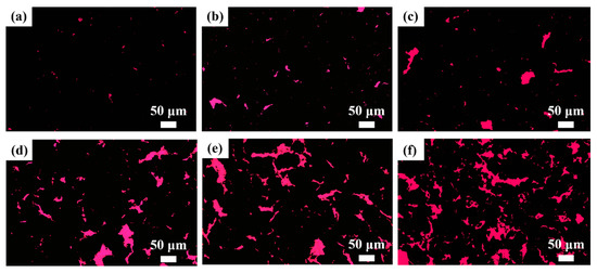 SEM images of the Cu–graphite composites with different graphite contents: (a) Cu–5 vol.% graphite, (b) Cu–10 vol.% graphite, (c) Cu–15 vol.% graphite, (d) Cu–20 vol.% graphite, (e) Cu–25 vol.% graphite and (f) Cu–30 vol.% graphite. The dark grey colored phase is the Cu matrix, while the dark pink colored phase is graphite.