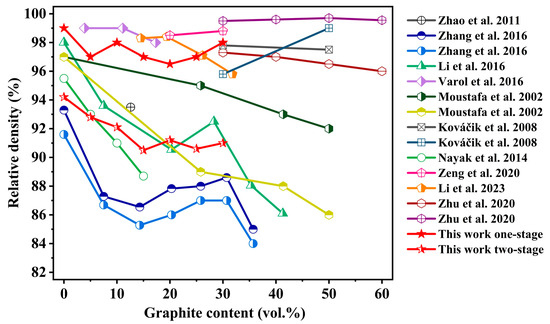 Relative density of Cu–graphite composites prepared by UAHP plotted as a function of graphite content. The relative densities of Cu–graphite composites prepared in previous studies are also included for comparison [3,4,5,6,8,9,10,20,23,24].