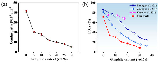 (a) Electrical conductivity of Cu–graphite composites with different graphite contents. (b) Comparison of electrical conductivity of Cu–graphite composites prepared in this work with the data from references [4,6].