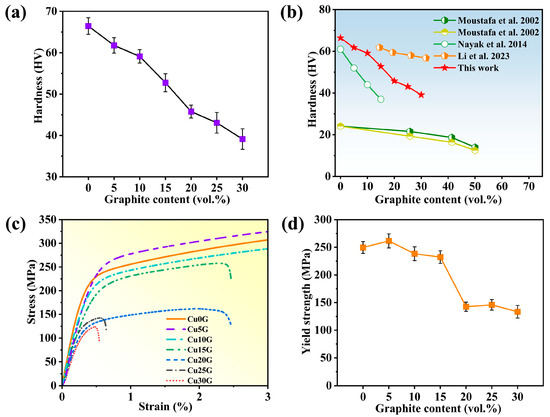 (a) Hardness of Cu–graphite composites with different graphite contents. (b) Comparison of hardness of Cu–graphite composites prepared in this work with the data from references [8,10,21]. (c) Yield strength and (d) flexural strength of Cu–graphite composites with different graphite contents.