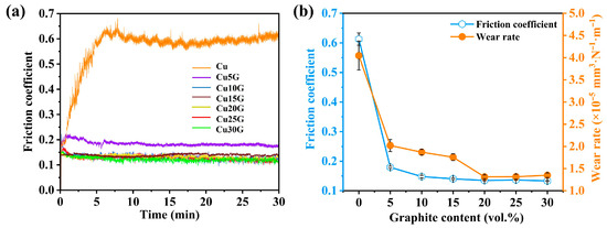 (a) Variation in friction coefficients over time for Cu–graphite composites with different graphite contents. (b) Average friction coefficients and wear rates of Cu–graphite composites with different graphite contents.