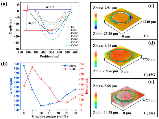 In Figure 9c–e, the 3D wear scar morphologies of pure Cu (c) and Cu–15 vol.% graphite (d) and Cu–30 vol.% graphite composites (e) are shown. For pure Cu, the wear scar exhibits an eccentric circular profile, indicating load instability during friction due to the absence of lubricating phases, in line with the friction coefficient change shown in Figure 8a. This instability results in combined normal and transverse loading during the wear process. These observations explain two key tribological characteristics of pure Cu: (1) the extended time required for the stabilization of the friction coefficient and (2) the significant fluctuations in the friction coefficient over time. The Cu–15 vol.% graphite composite exhibits a highly circular wear scar morphology with a narrow width (Figure 9d). The uniform scar depth, evidenced by consistent color mapping, demonstrates effective load-bearing by the Cu matrix enabled by graphite lubrication. This optimized stress distribution accounts for the exceptional stability of the friction coefficient over time observed in this composition, as shown in Figure 8a. The Cu–30 vol.% graphite composite displays a wider wear scar compared to the Cu–15 vol.% composite, consistent with the earlier discussion of this phenomenon. However, compared to pure Cu, the Cu–30 vol.% graphite composite exhibits both a shallower and more uniform scar depth. This demonstrates that while hardness reduction increases scar width, the effective graphite lubrication prevents further subsurface damage by load dissipation. Consequently, Cu–graphite composites maintain stable wear resistance even at high graphite loadings (>20 vol.%), avoiding the sharp wear rate increase.