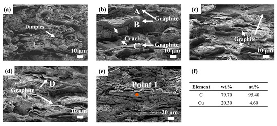 Fracture surfaces of Cu–graphite composites with different graphite contents. (a) Cu–15 vol.% graphite. (b) Cu–20 vol.% graphite; the labels A, B and C indicate three exposed graphite flakes. (c) Cu–25 vol.% graphite. (d) Cu–30 vol.% graphite; a severely deformed graphite flake can be observed in D. (e) Cu–30 vol.% graphite composite with EDS point analysis performed on an exposed graphite flake (Point 1). (f)The corresponding EDS results for the Cu-30G sample are tabulated.