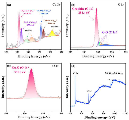 XPS analysis of the worn surface of Cu–30 vol.% graphite: (a) Cu 2p spectrum, (b) C1s spectrum, (c) O1s spectrum and (d) the XPS survey spectrum.