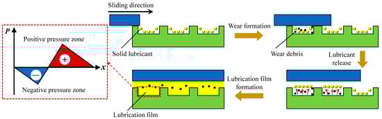 Lubrication mechanism of surface texture storage lubricant and wear debris [,].
