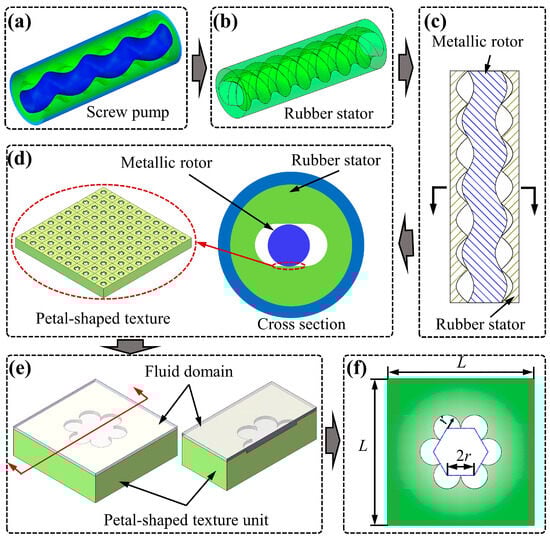 Figure 2a–f presents the geometric model of the screw pump, the geometric model of the screw pump the rubber stator, an axial section view of the friction pair between the stator and rotor, a cross-sectional view of this friction pair, the micro-pit texture unit and fluid domain, and a parameter diagram for the domain unit. The designed petal-shaped micro-pit texture on the inside wall of the rubber stator has six circular petal units. The radius of each petal unit was denoted by r, its center positioned at each vertex of a central hexagon having a side length of 2r, and the side length of the fluid domain unit is denoted L. The dimensions of this micro-pit petal-shaped texture could be adjusted by varying r accordingly. Furthermore, the area ratio (Sp) could be adjusted by varying dimensions within the fluid domain unit. This area ratio could be calculated using Equation (1).