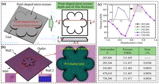 Mesh generation and grid independence verification for the petal-shaped micro-pit textured fluid domain on the stator rubber inner wall. (a) Geometric parameters of fluid domain, (b) Fluid domain grid, and (c) Mesh independence verification.