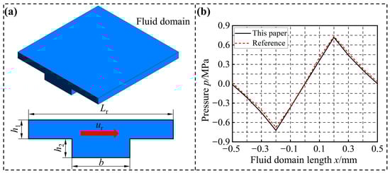 Verification of simulation models and results in the reference. (a) The calculation domain model diagram in the reference and (b) Pressure comparison between this study and reference [].