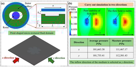 The influence of the medium flow direction on the hydrodynamic lubrication performance of petal-shaped micro-pit textures was evaluated for the texture model with area ratio of 10% and a petal size of 400 μm. The medium flow direction of the medium was simulated for the directions following the x and y axes, as shown in Figure 5a. The pressure distribution of the oil film was consistent regardless of the inflow direction, as shown in Figure 5b. The distribution comprised a negative pressure zone followed by a positive pressure zone, with the area of the negative pressure zone being smaller than that of the positive pressure zone. It could be observed that the micro-pit petal-shaped texture generated net load-carrying capacity and exhibited high lubrication performance. The average and maximum pressures for different flow directions indicated that when the medium flowed from the y-direction, the average and maximum pressures generated by the oil film were higher than those observed for the flow in the x-direction, and compared with the non-textured surface, the oil film load-carrying capacity was increased by over 7.3%. This was due to that the resistance was lower and the flow is smoother in the y-direction. Compared with the x-direction, the y-direction mitigated turbulence upon contact with the texture, which made it more favorable.