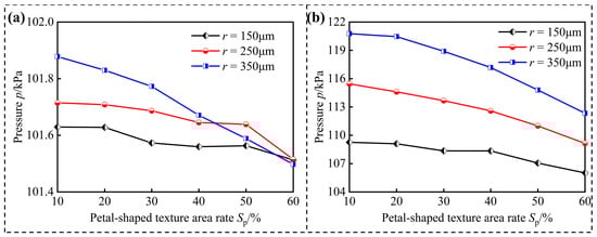 The size of the petal-shaped micro-pit texture exhibited a complex relationship with its area ratio. The oil film load-carrying capacity of the petal-shaped micro-pit texture with petal sizes of 150 μm, 250 μm and 350 μm was simulated and analyzed for different area ratios. Figure 6a,b illustrate the load-carrying capacity of the oil film on the petal-shaped micro-pit texture. It could be seen that when the petal-shaped micro-pit texture area ratio increased, the average pressure and maximum pressure on the oil film surface showed a decreasing trend. When the area ratio of petal-shaped micro-pit texture was 10%, the average pressure and maximum pressure on the oil film surface reached their maximum values. On the contrary, when the area ratio was 60%, the average pressure and maximum pressure on the oil film surface reached their minimum values. This was due to that, when the size of the petal-shaped micro-pit texture remained unchanged, the increase of area ratio resulted in a decreasing the size of the fluid domain, increasing the number of textures per unit area, and decreasing the texture spacing. The divergence and the convergence areas of the adjacent texture significantly interacted. That was, the convergence area of the previous round pit and the divergence area of the latter pit were partially eliminated. In addition, when the medium flowed through the petal-shaped micro-pit texture, the stability of the flow field decreased, which reduced the load-carrying capacity of the oil film. For the three sizes of petal-shaped micro-pit textures, the average pressure was decreased by 0.11%, 0.20% and 0.37%, while the maximum pressure decreased by 2.98%, 5.47% and 6.98%, respectively.
