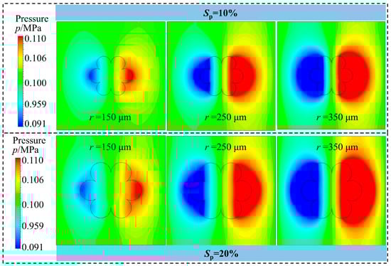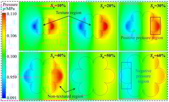 Figure 7 illustrates the surface pressure of the oil film for different area ratios of the petal-shaped micro-pit texture with a size of 150 μm. It could be seen that the pressure distributions on the surface of the oil film were the same. After the medium flows through the petal-shaped micro-pit texture, a negative pressure zone was first formed, followed by a positiveone, which indicated that the hydrodynamic lubrication effect was generated in the pit area of the micro-pit petal-shaped texture. The positive pressure region of the upward lifting force produced by the lubricating oil in the pit area was greater than that of the negative pressure region, leading to a net pressure that increased the load-carrying capacity of the oil film. It could also be observed that, when the area ratio of the petal-shaped micro-pit texture increased, the load-carrying capacity of the oil film was gradually decreased.
