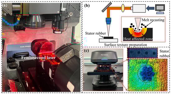 The process involves creating a petal-shaped micro-pit texture on the surface of high-acrylonitrile stator rubber. (a) Femtosecond laser manufacturing system LMS12, (b) Laser micro-pit texture principle, and (c) Petal-shaped micro-pit textured surface morphology.