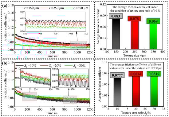 Figure 11a illustrates a texture sample with a petal-shaped micro-pit texture area ratio of 10%. Under a load of 10 N, the friction coefficient of different texture diameters changes over time. The texture sizes were 150 μm, 250 μm, and 350 μm, respectively. The surface friction coefficients of all three samples demonstrated a declining trend and reached a stable stage after 800 s. Throughout the entire wear test, the 150 μm texture showed a more significant decreasing trend, and the texture friction coefficient of 350 μm was always lower than that of the other two groups, showing the best wear reduction effect. In the initial wear stage, the friction coefficient was high, because the contact between the steel ball surface and the textured surface was not completely stable, and the surface texture did not give full play to the role of oil storage and accommodation of wear debris. With the extension of time, the oil film gradually formed, the ability of texture to store oil and capture wear debris increased, and the friction coefficient tended to be stable. By analysing the average friction coefficients of the three sizes of petal-shaped micro-pit textures, it could be observed that the average friction coefficient decreased as the texture size increased. The reason was that the larger size of micro-pits could store more lubricating oil and form a more complete oil film, so it showed the lowest average friction coefficient.