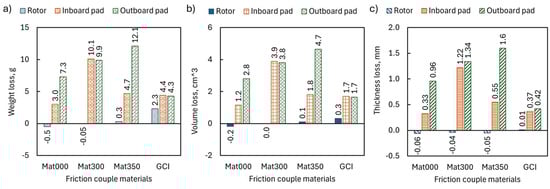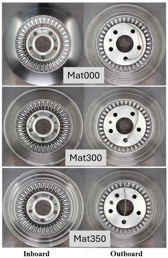 - Long-term durability and maintenance considerationsThe wear data indicate that Al-MMC brake rotors have the potential to endure the entire lifespan of a vehicle [41] owing to their exceptional wear resistance and the formation of a protective transfer layer. Nevertheless, this benefit is accompanied by increased brake pad consumption, particularly for specific formulations such as Mat350. This trade-off necessitates careful evaluation of the overall system cost and maintenance requirements. The selection of the rotor variant depends on the intended application. For general use, Mat000 is preferable owing to its lower wear rate, although it may compromise braking power. In contrast, for performance-oriented applications where stopping power is paramount, Mat350 is superior; its higher wear rate suggests that it is more suitable for scenarios in which rotors can be replaced more frequently. Mat300 provides a balance between braking performance and durability, rendering it a versatile option for a wide range of conditions. Pairing these rotors with brake pads that complement their friction characteristics could further enhance the overall braking efficiency and longevity.