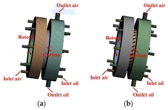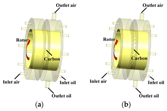 - Under the working condition of 1 kPa, the oil leakage of the graphite with oil-return groove structure reduced. The oil leakage decreases by 87.6% at 1 s, 82.3% at 2 s, and 98.1% at 3 s. Furthermore, the length and number of oil-return groove increased, and the leakage of lubricating oil decreased. The effect of change in the width of the oil-return groove on oil leakage is negligible.