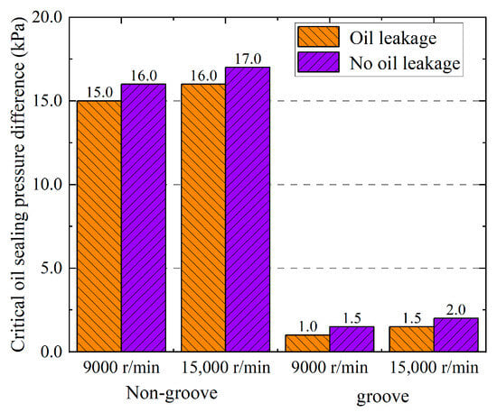 - The critical sealing pressure difference of the conventional bearing cavity sealing system is 15~16 kPa when the rotate speed is 9000 r/min, and the critical sealing pressure difference is 16~17 kPa when the rotate speed is 15,000 r/min. The critical sealing pressure difference of the bearing cavity sealing system with oil-return groove graphite is 1~1.5 kPa when the rotate speed is 9000 r/min, and the critical sealing pressure difference is 1.5~2.0 kPa when the rotate speed is 15,000 r/min. Under the same working conditions, the critical sealing oil pressure difference of the graphite with oil-return groove bearing cavity sealing system is more than 90% lower than that of the conventional bearing cavity sealing system.