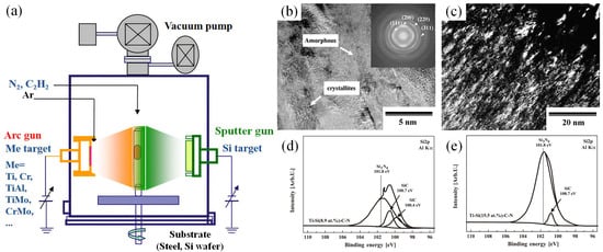 - Jeon, J.-H.; Choi, S.R.; Chung, W.S.; Kim, K.H. Synthesis and characterization of quaternary Ti–Si–C–N coatings prepared by a hybrid deposition technique. Surf. Coat. Technol. 2004, 188–189, 415–419. [Google Scholar] [CrossRef]